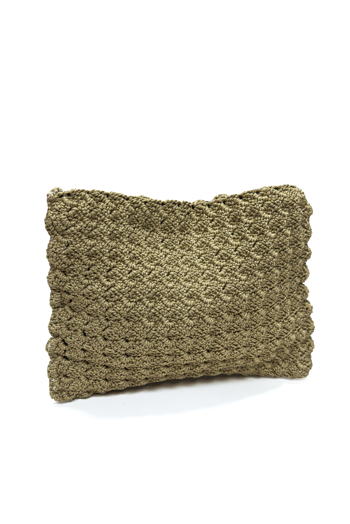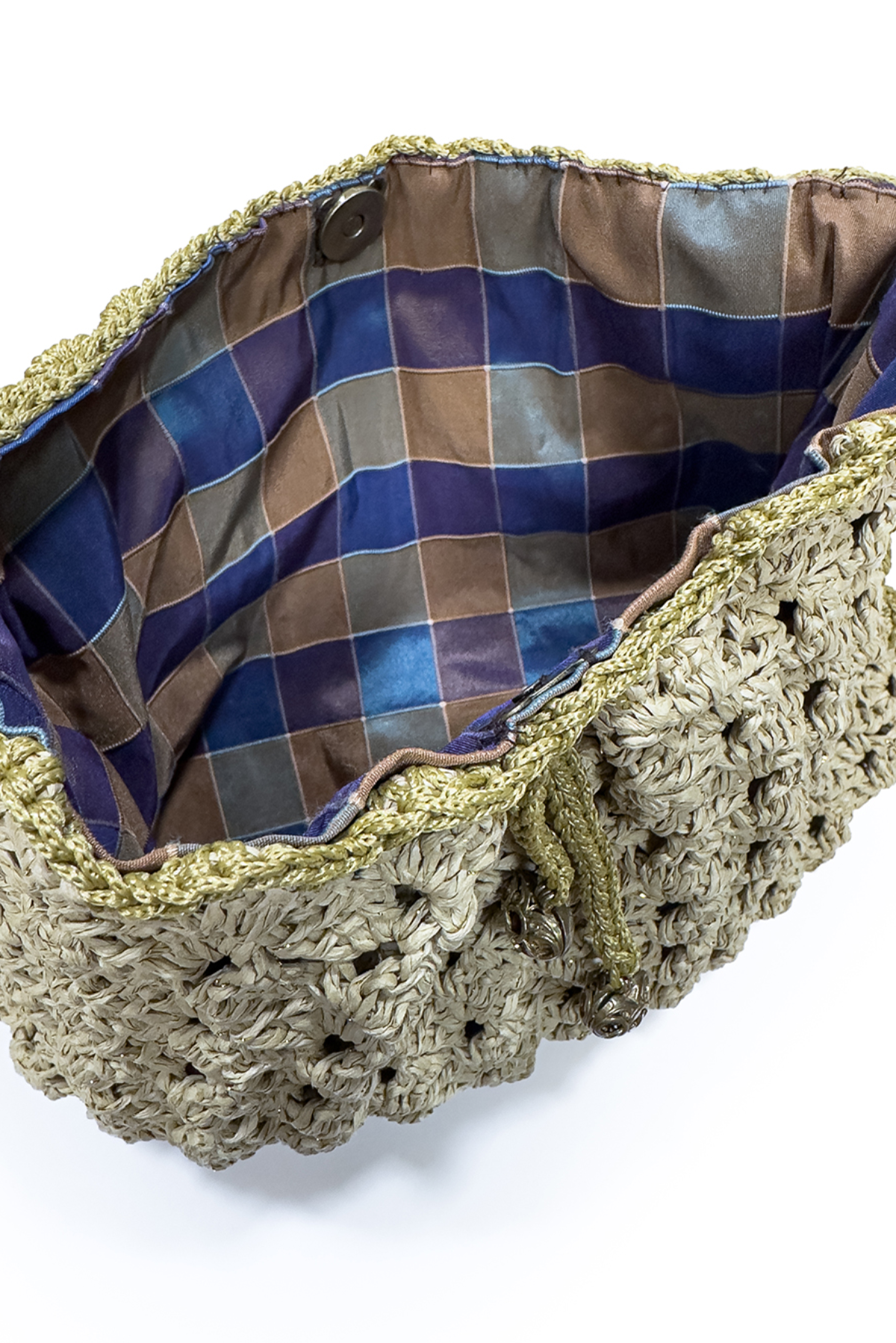 Arka yüzeyi yağ yeşili polyester ip, ön yüzeyi ise simli kâğıt ip kullanılarak tasarlanmış bu clutch çanta; dokusal kontrastı ve zarif ışıltısıyla dikkat çeker. Pileli formu çantaya hacim ve şıklık katarken, boncuk aksesuar detayı tasarımı tamamlayan özel bir dokunuş sunar.