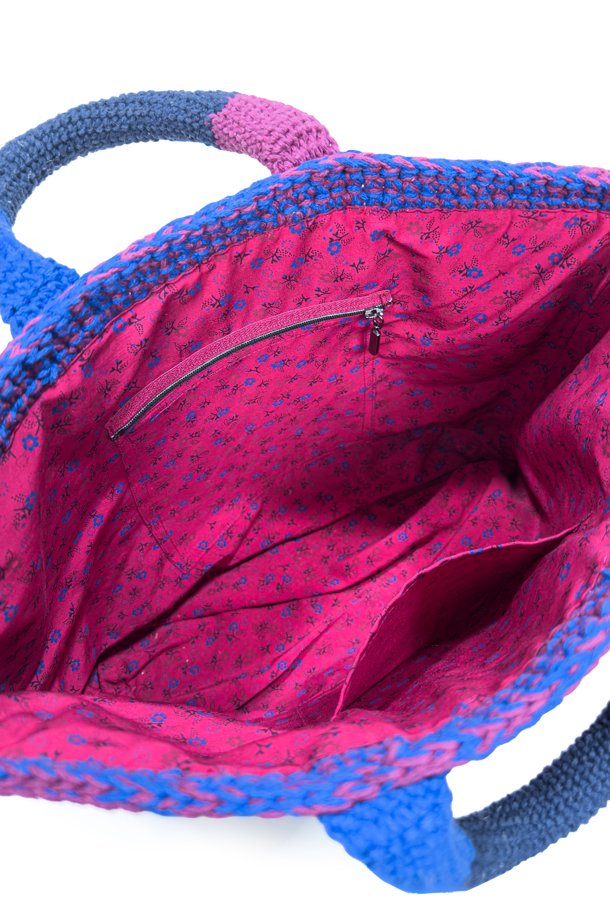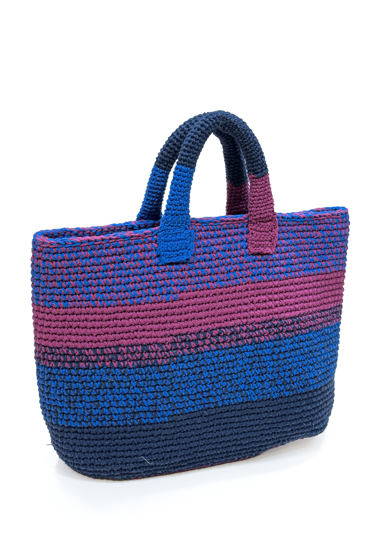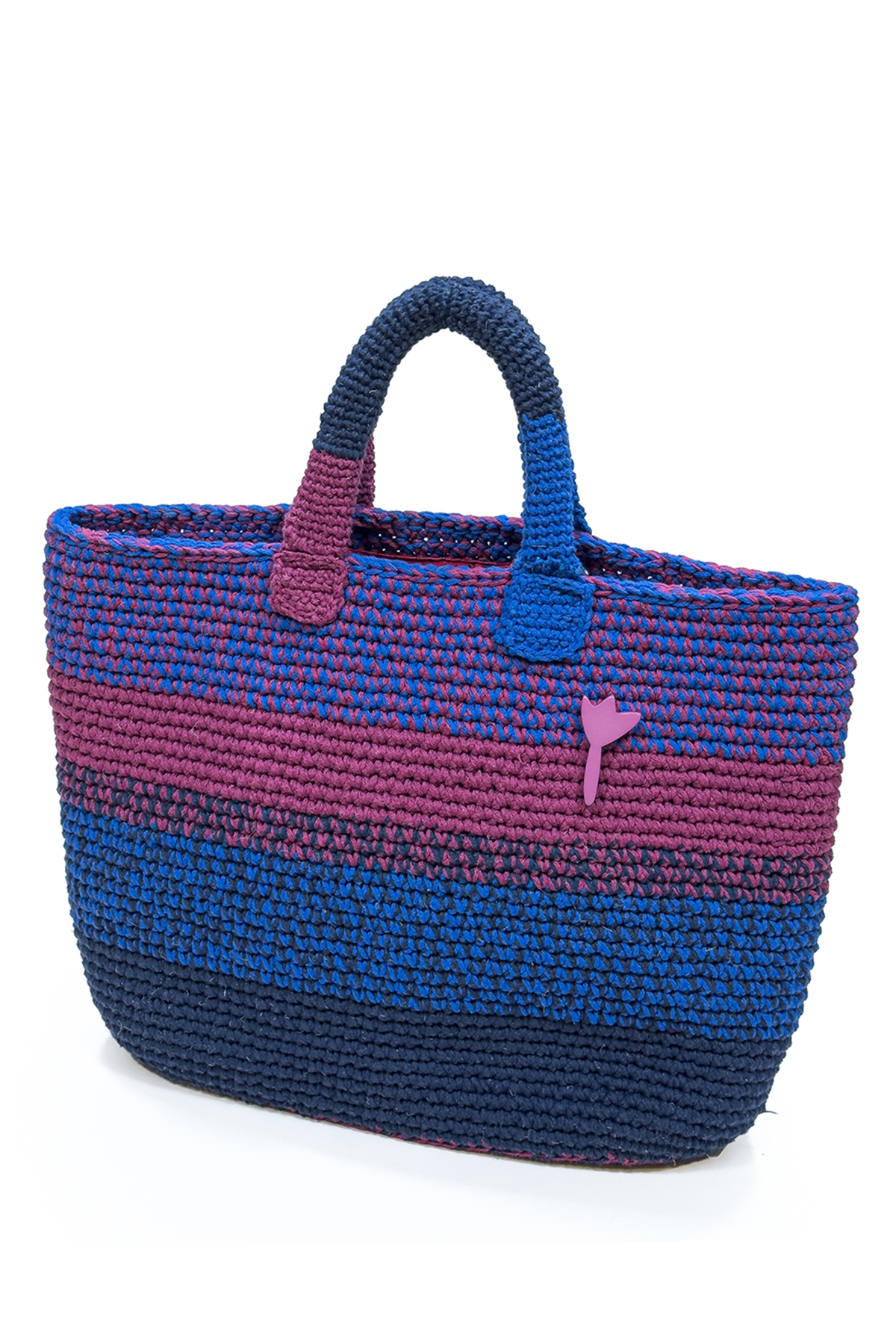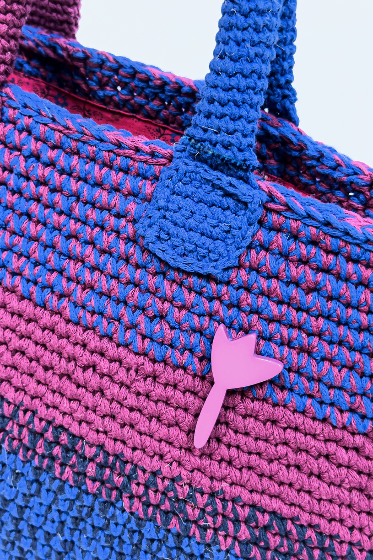 Tığ işi tekniğiyle, pamuk makrome ip kullanılarak hazırlanan bu özel tasarım çanta; mavi, pembe ve lacivert renk kombinasyonuyla canlı ve modern bir görünüm sunar. El işçiliğinin sıcak dokusu, çantaya özgün ve dikkat çekici bir karakter kazandırır.