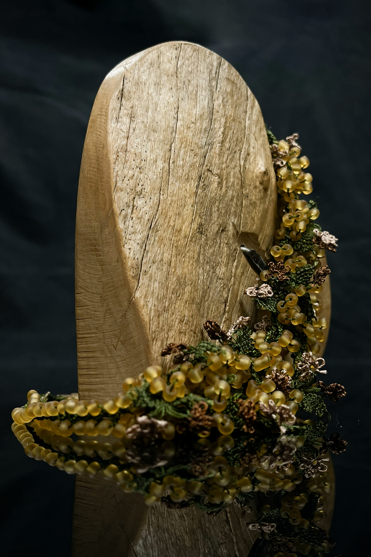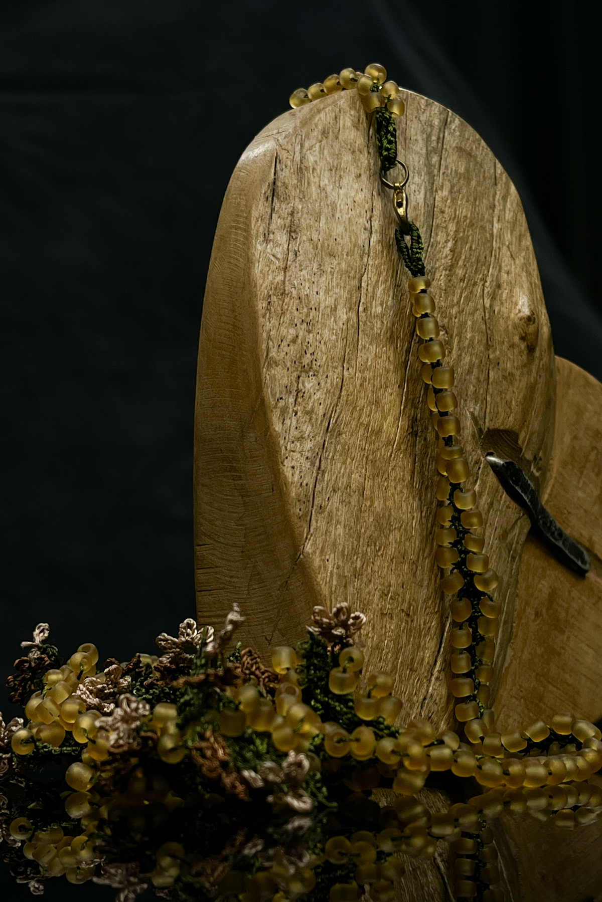 El örgüsü teknikle hazırlanmış, iğne oyası detaylara sahip bohem tarz kolye. Sarı tonlu boncuklar ve yeşil iplerle oluşturulan örgü yapı, kolyeye doğal ve otantik bir görünüm kazandırır. El emeği olması sebebiyle her detayı özgün ve karakteristiktir.