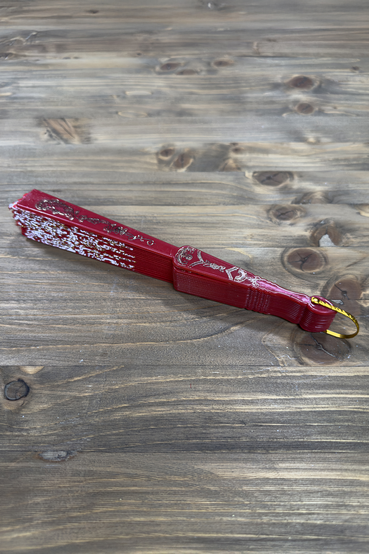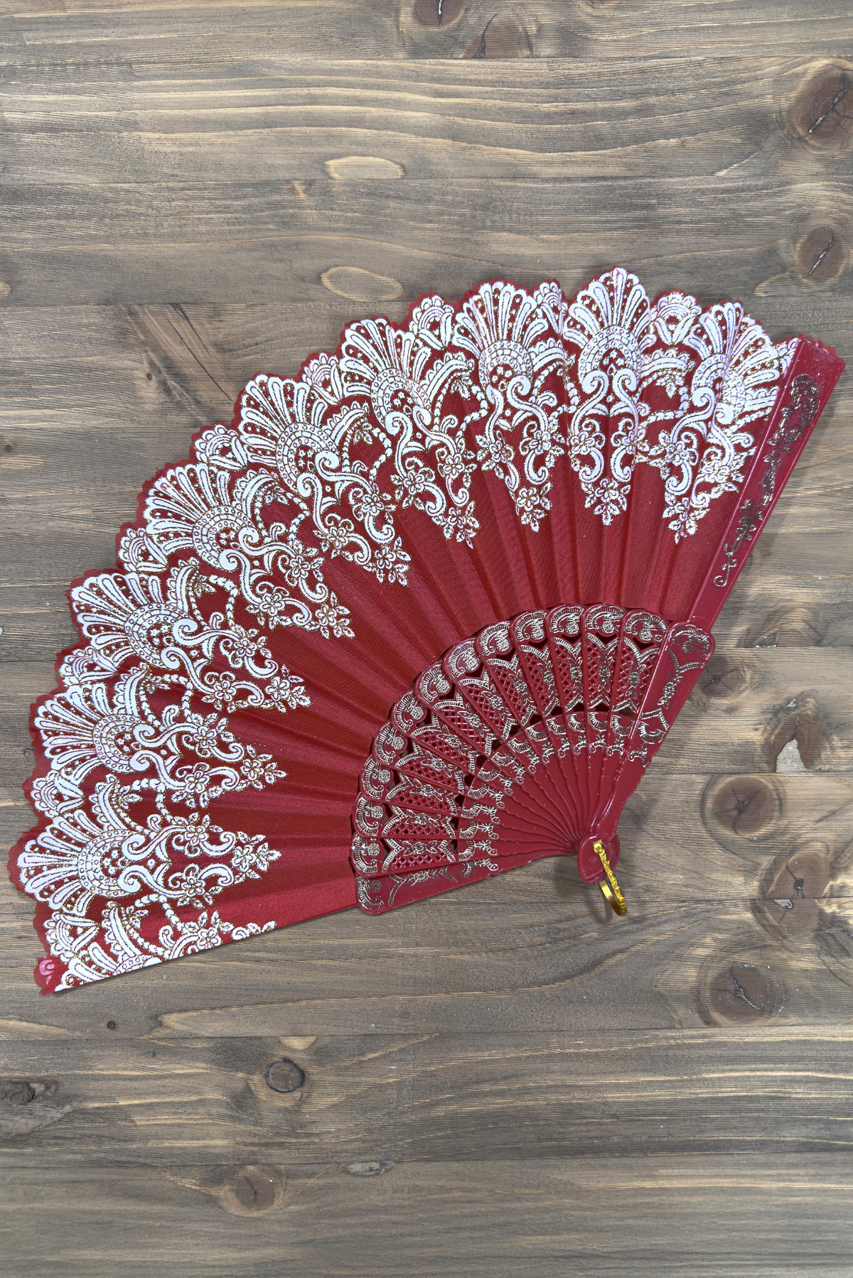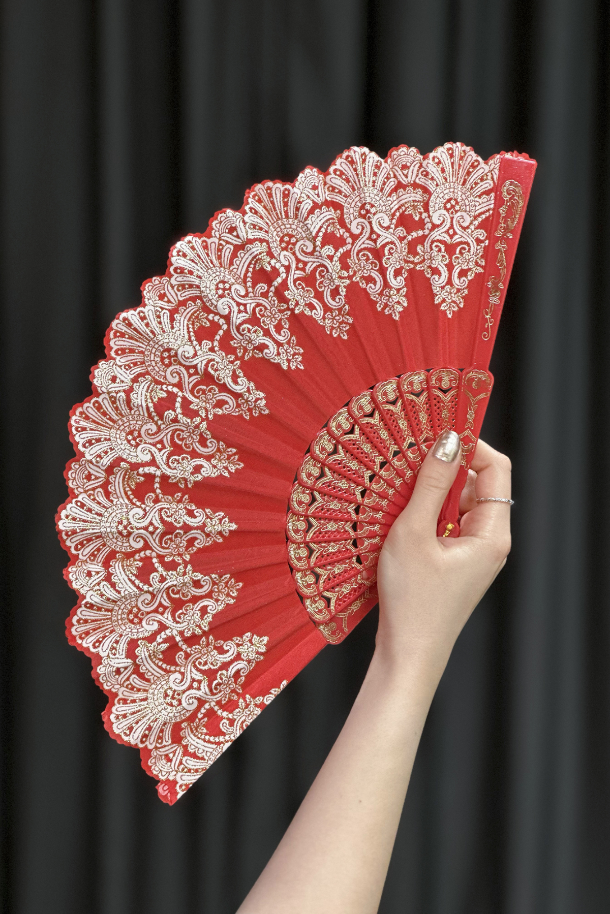 Tutkunun ve zarafetin rengi kırmızının, ışıltılı altın rengi işlemelerle buluştuğu bu özel tasarım el yelpazesi, güçlü ve etkileyici bir duruş sergiler.