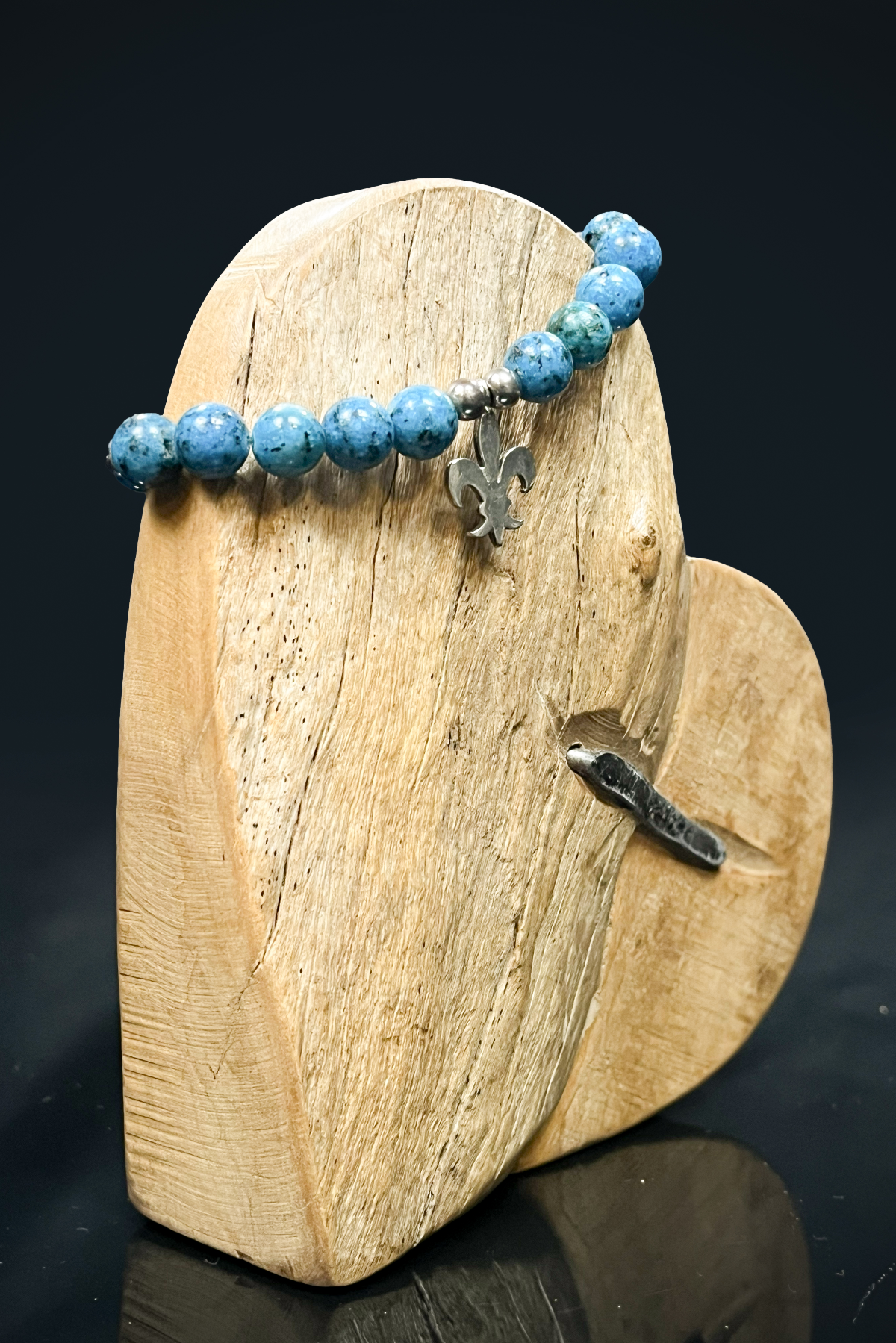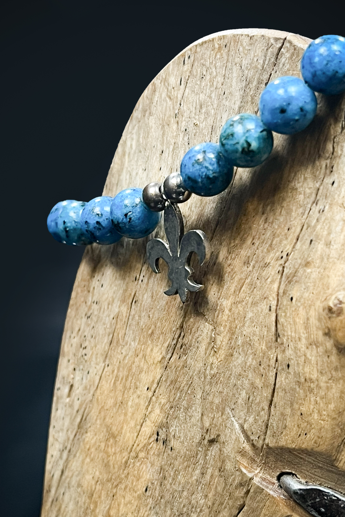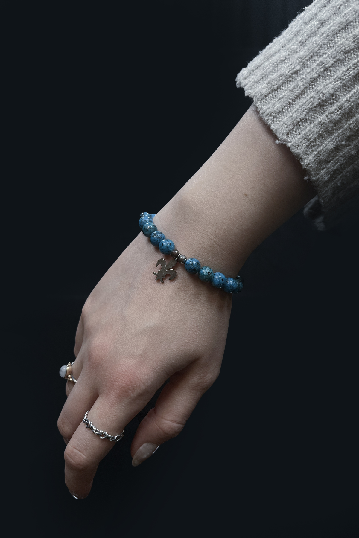 Canlı mavi tonu ve doğal dokusuyla dikkat çeken mavi howlit (boyanmış howlit) taşlı bileklik, sade ama karakterli bir görünüm sunar. Yuvarlak kesim taşlar bilekte dengeli ve şık bir duruş sağlarken, ortasında yer alan metal detaylı sembol bilekliğe özgün bir hava katar.