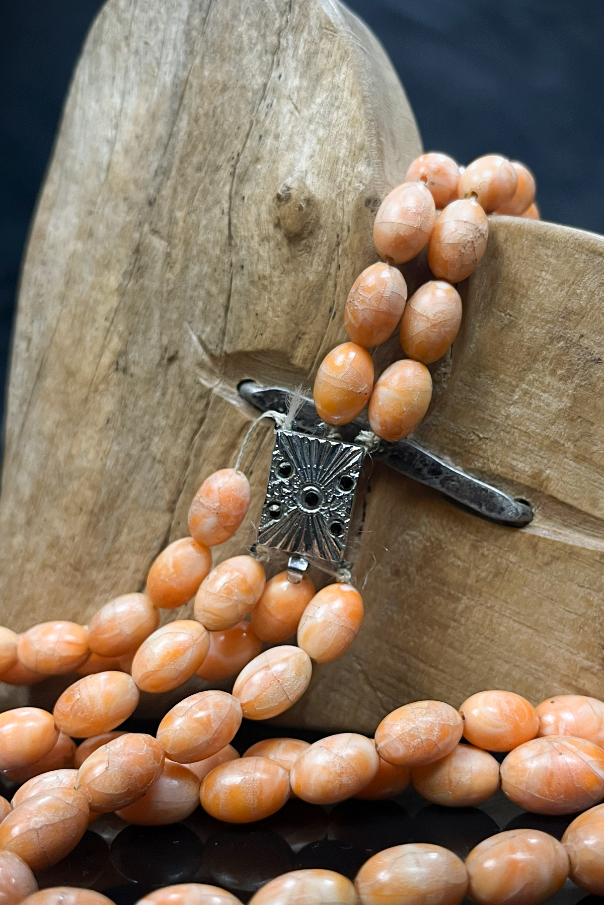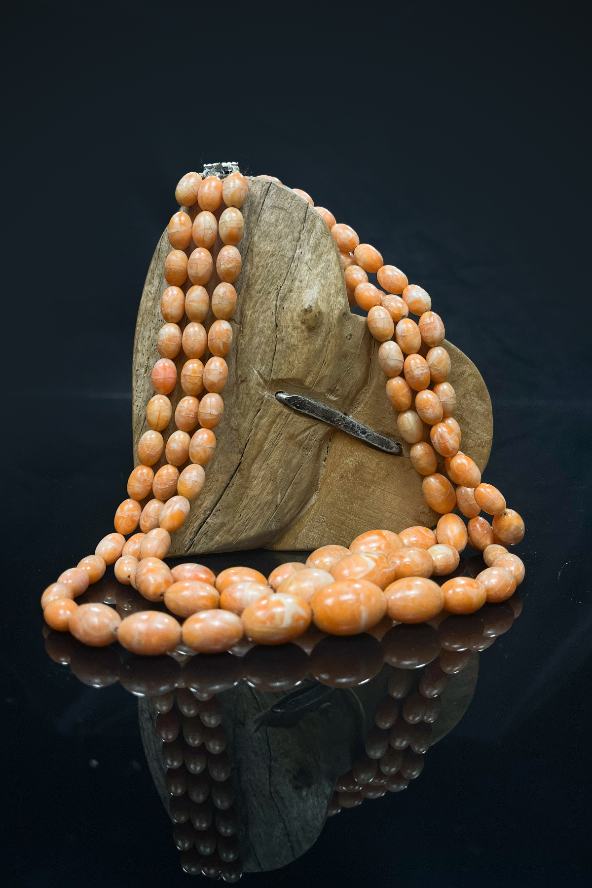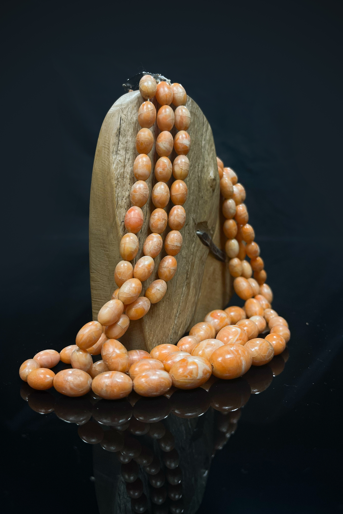 Turuncu ve krem tonlarında, oval formda boncuklardan oluşan şık bir kolye modelidir. Boncukların malzemesi kesin olarak bilinmemekle birlikte plastik veya reçine esaslı olabileceği düşünülmektedir. Hafif yapısı sayesinde kullanım sırasında rahatsızlık vermez.